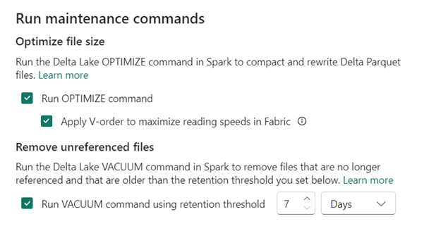 The operations – OPTIMIZE, V-ORDER, Z-ORDER and VACUUM are table maintenance operations that need to be run periodically for optimized performance and costs.